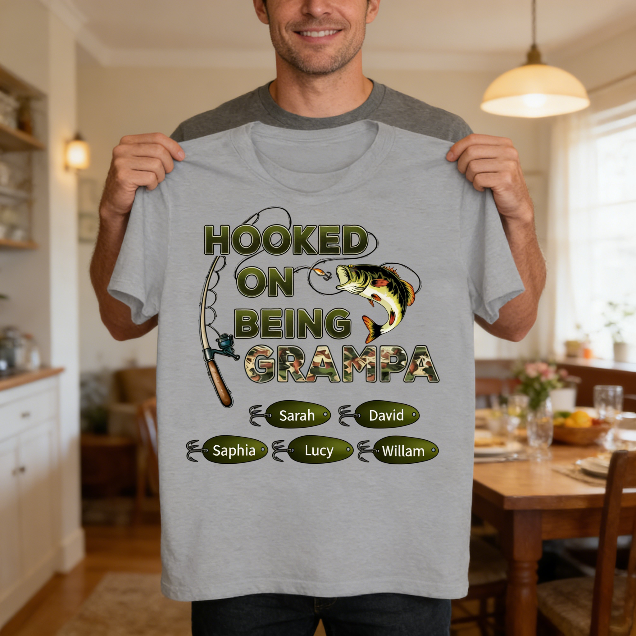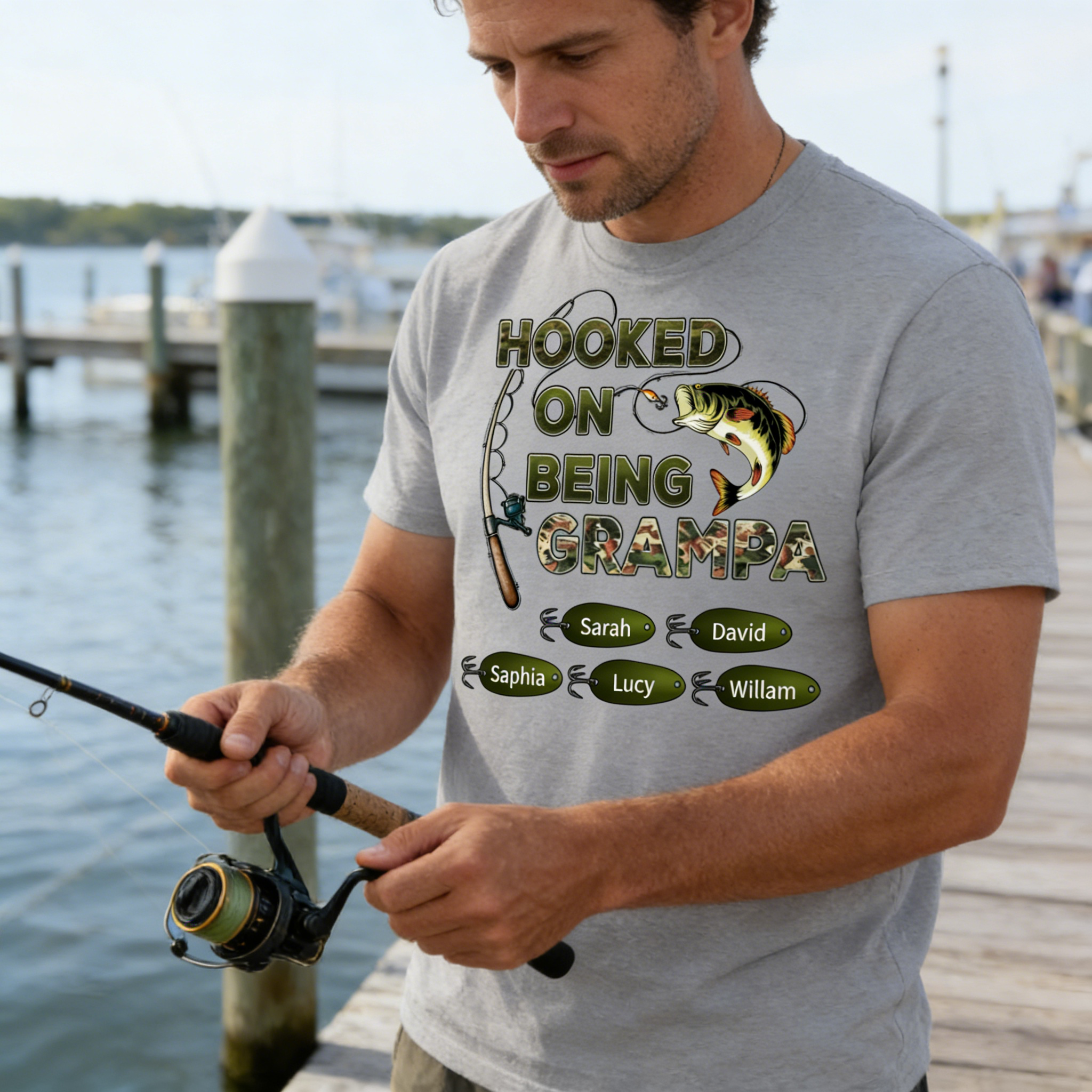Hooked On Being Grandpa Fishing Camouflage - Personalized T-Shirt - Father's Day Gift